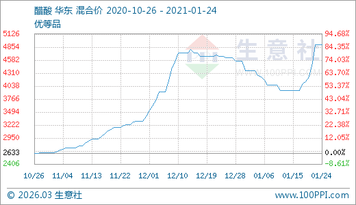 醋酸01月24日最新價格4900.00元/噸,最近5天上漲18.55%,10天上漲24.05%,60天上漲51.55%。