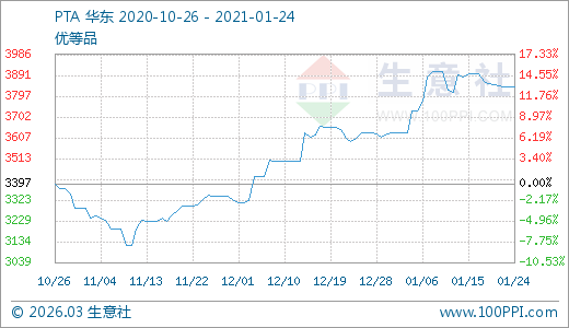 01月24日PTA價格3841.11元/噸 60天上漲14.70%