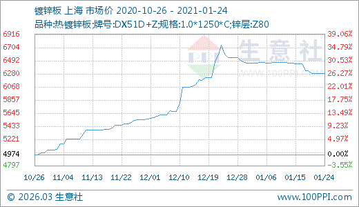 01月24日鍍鋅板6288.00元/噸 60天上漲14.49%
