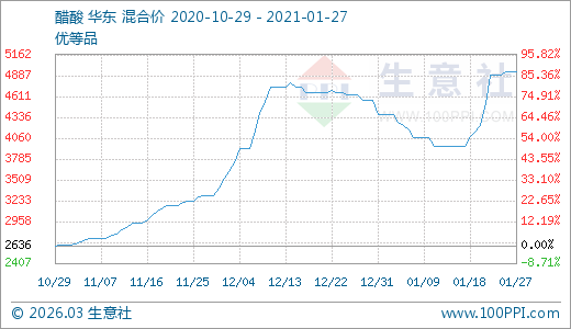 醋酸01月27日最新價格4933.33元/噸,最近10天上漲24.89%,60天上漲49.49%。
