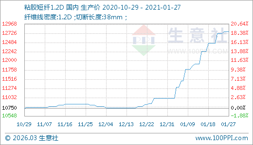 01月27日粘膠短纖12766.67元/噸 20天上漲11.26%