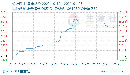 01月28日鍍鋅板6256.00元/噸 60天上漲12.88%