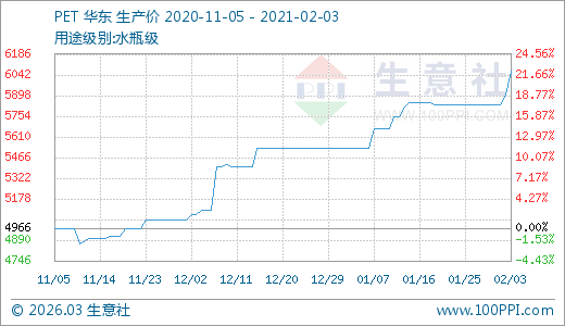 02月03日PET價格6066.67元/噸 5天上漲4.00%