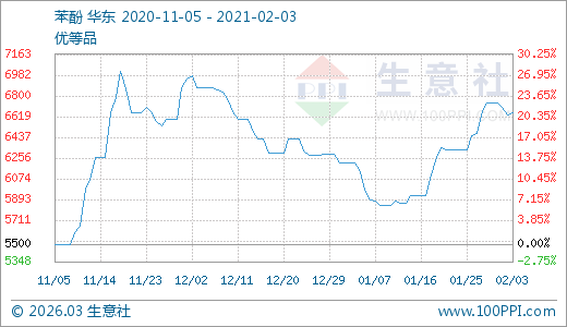 02月03日苯酚6620.00元/噸 10天上漲7.47%