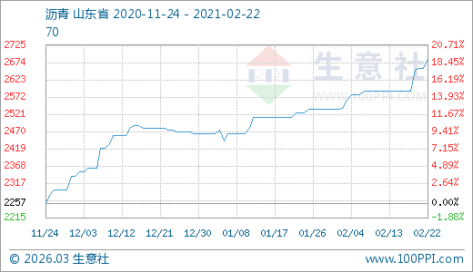 瀝青02月22日最新價格2682.50元/噸,最近5天上漲3.57%。