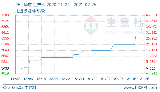 02月25日PET價格7166.67元/噸 5天上漲8.59%