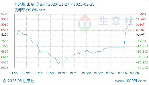 02月25日苯乙烯9383.33元/噸 5天上漲6.23%