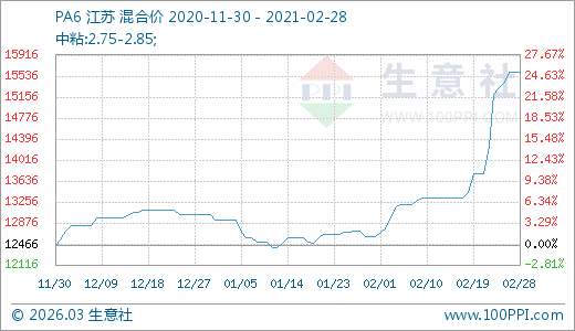 PA6 02月28日最新價格15600.00元/噸,最近10天上漲16.13%,15天上漲17.00%,20天上漲17.59%,30天上漲23.48%。