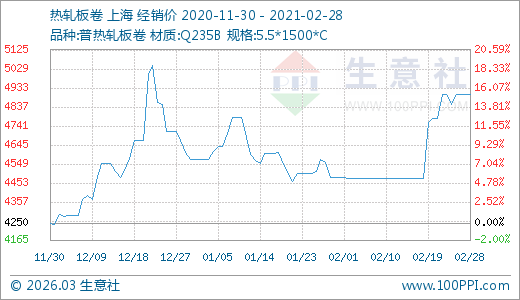 02月28日熱軋板卷4900.00元/噸 10天上漲9.50%