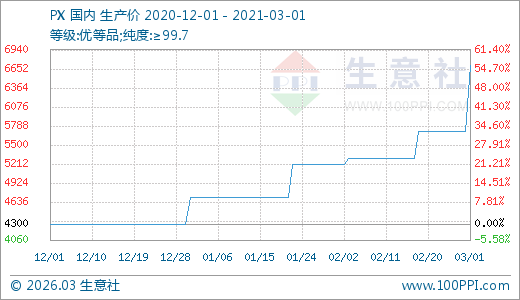 PX 03月01日最新價格6700.00元/噸,最近5天上漲17.54%,15天上漲26.42%,30天上漲28.85%,60天上漲42.55%。