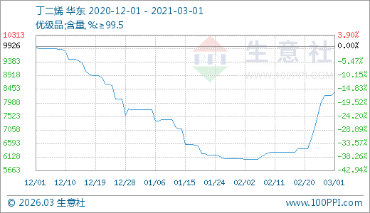 03月01日丁二烯8368.89元/噸 5天上漲10.96%