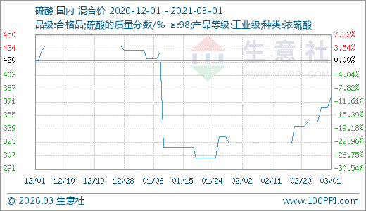 03月01日硫酸377.50元/噸 5天上漲8.63%