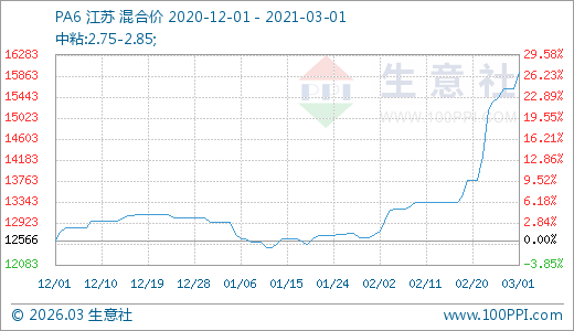 PA6 03月01日最新價格15933.33元/噸,最近5天上漲3.91%,10天上漲15.74%,15天上漲19.50%,30天上漲26.12%。
