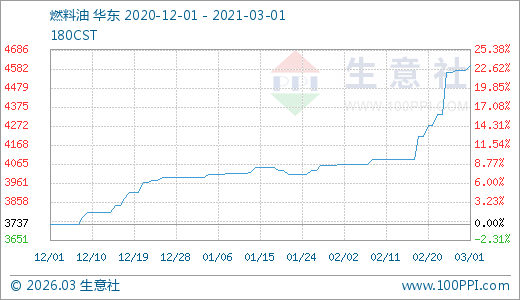 03月01日燃料油4600.00元/噸 10天上漲9.20%