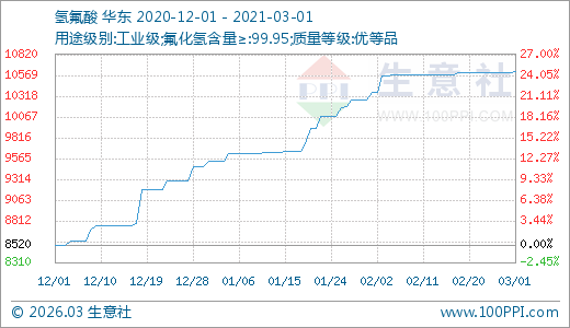 03月01日氫氟酸10611.11元/噸 60天上漲11.34%