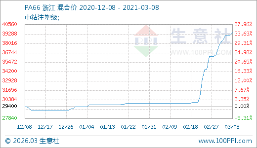 03月08日PA66價格39500.00元/噸 5天上漲3.67%