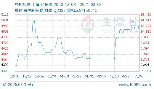 03月08日熱軋板卷5012.50元/噸 20天上漲12.01%