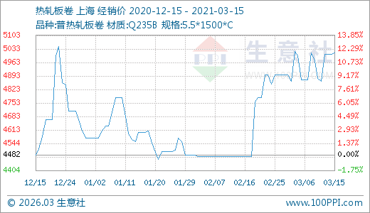 03月15日熱軋板卷5012.50元/噸 30天上漲12.01%