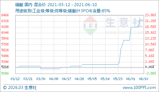 06月10日磷酸6350.00元/噸 10天上漲8.24%