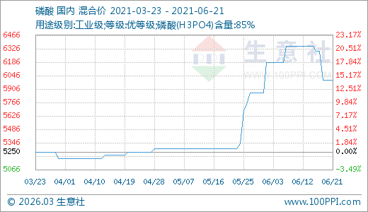 06月21日磷酸6000.00元/噸 30天上漲13.56%
