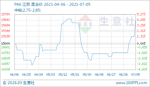 PA6 07月05日最新價格15666.67元/噸,最近5天上漲4.44%,10天上漲6.09%。