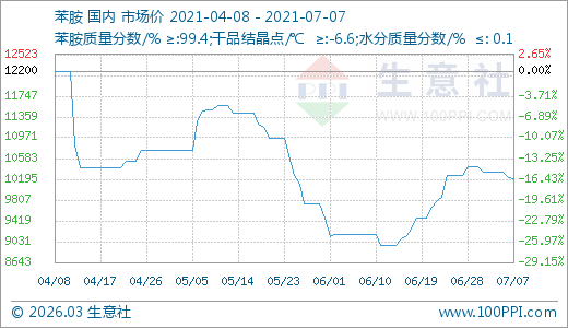 07月07日苯胺10200.00元/噸 20天上漲10.07%