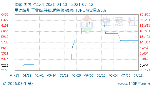 07月12日磷酸5833.33元/噸 60天上漲10.41%