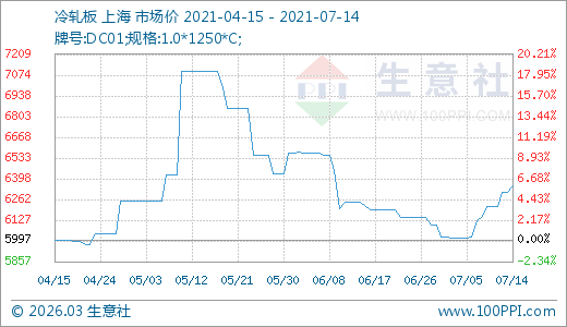 冷軋板07月14日最新價格6352.50元/噸,最近10天上漲5.70%。