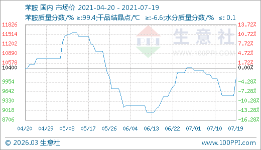07月19日苯胺10100.00元/噸 5天上漲6.32%