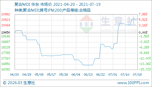MDI 07月19日最新價格20600.00元/噸,最近15天上漲10.90%,20天上漲12.41%,30天上漲18.90%。
