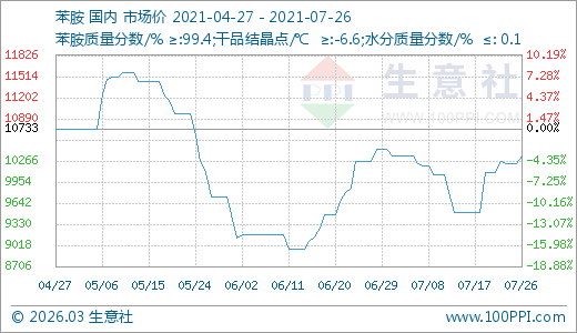 苯胺07月26日最新價(jià)格10333.33元/噸,最近10天上漲8.77%。