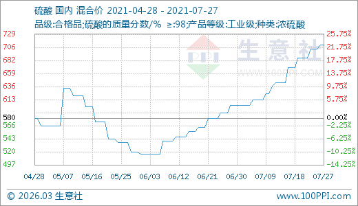 07月27日硫酸710.00元/噸 5天上漲3.40%