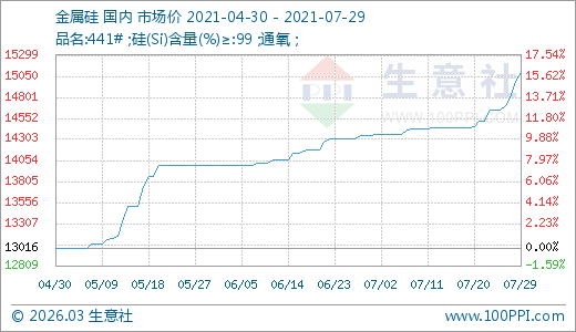 金屬硅07月29日最新價(jià)格15091.67元/噸,最近5天上漲3.01%。