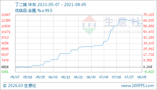 08月05日丁二烯11091.11元/噸 30天上漲23.75%