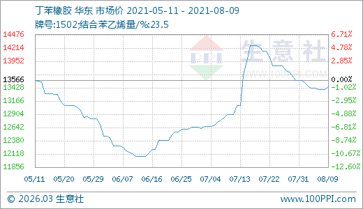 丁苯橡膠08月09日最新價(jià)格13450.00元/噸,最近60天上漲11.08%。