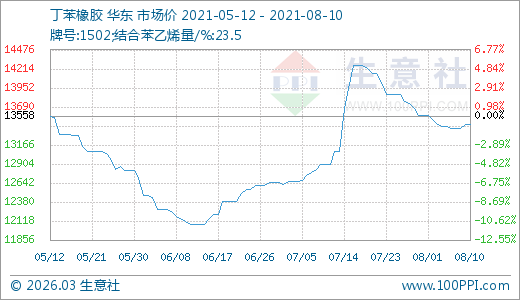 丁苯橡膠08月10日最新價(jià)格13450.00元/噸,最近60天上漲11.39%。