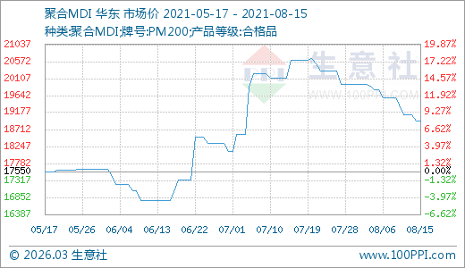 MDI 08月15日最新價格18950.00元/噸,最近60天上漲12.97%。