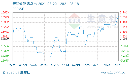 天然橡膠08月18日最新價格13550.00元/噸,最近60天上漲10.05%。