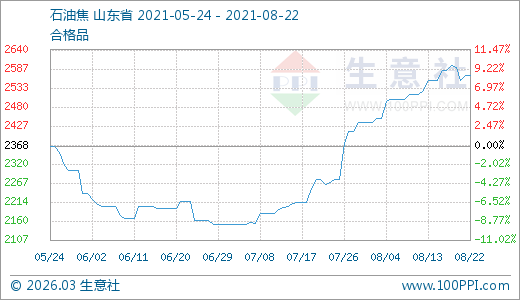 石油焦08月22日最新價格2568.50元/噸,最近30天上漲13.20%,60天上漲15.94%。