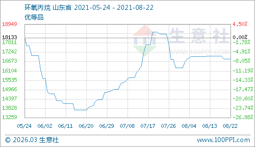 08月22日環(huán)氧丙烷16825.00元/噸 60天上漲20.18%
