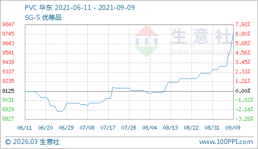 09月09日PVC價格9762.50元/噸 5天上漲3.86%