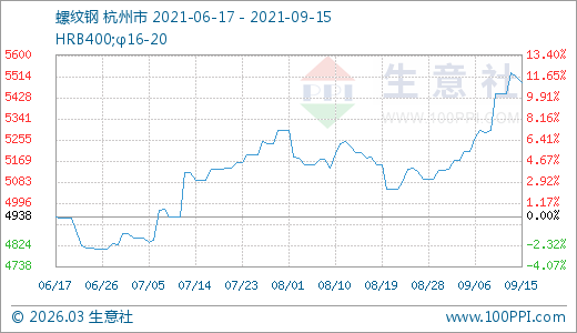 09月15日螺紋鋼5491.11元/噸 10天上漲5.44%