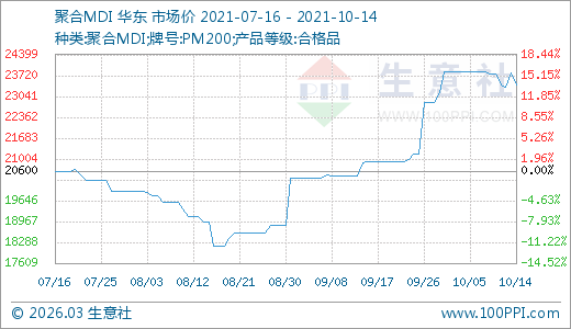 MDI 10月14日最新價(jià)格23400.00元/噸,最近20天上漲10.55%,30天上漲12.10%,60天上漲23.48%。