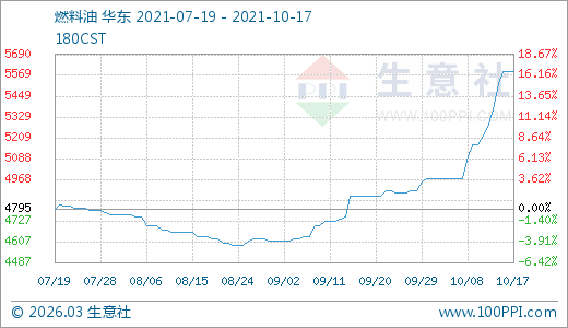 燃料油10月17日最新價格5590.00元/噸,最近5天上漲6.07%,10天上漲12.47%,20天上漲14.08%,30天上漲14.78%,60天上漲20.54%。