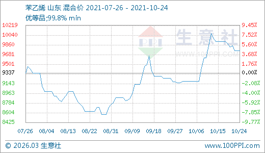 10月24日苯乙烯9750.00元/噸 60天上漲12.07%