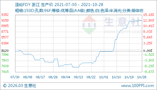 滌綸FDY 10月28日最新價(jià)格9162.86元/噸,最近20天上漲12.27%,30天上漲13.06%,60天上漲16.64%。