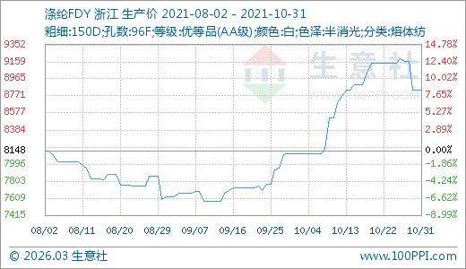 10月31日滌綸FDY價(jià)格8834.29元/噸 60天上漲15.83%
