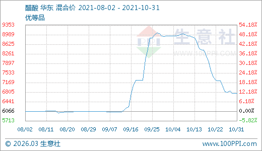 10月31日醋酸6750.00元/噸 60天上漲11.39%