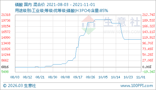 磷酸11月01日最新價格14533.33元/噸,最近60天上漲89.98%。