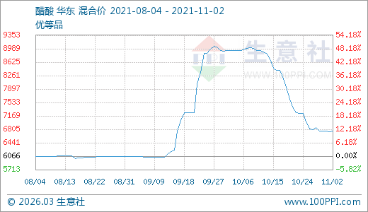 11月02日醋酸6750.00元/噸 60天上漲11.39%